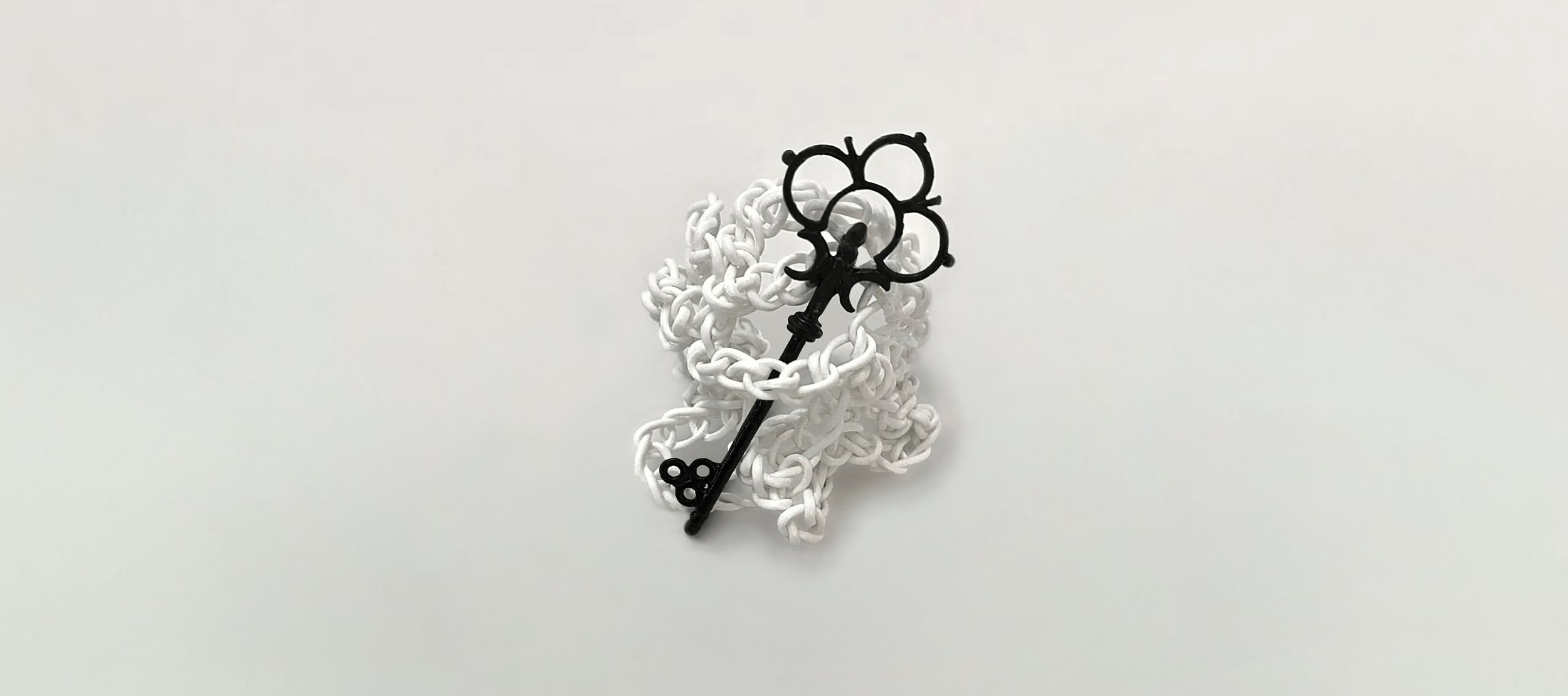 “Chiave di lettura” (“Interpretive key”) is a small-scale work that plays with the linguistic ambiguity of the very expression from which it takes its name. The piece gives physical form to the idiom, turning the metaphor into an object. The “chiave di lettura” becomes an actual key, suspended within a self-supporting white net.