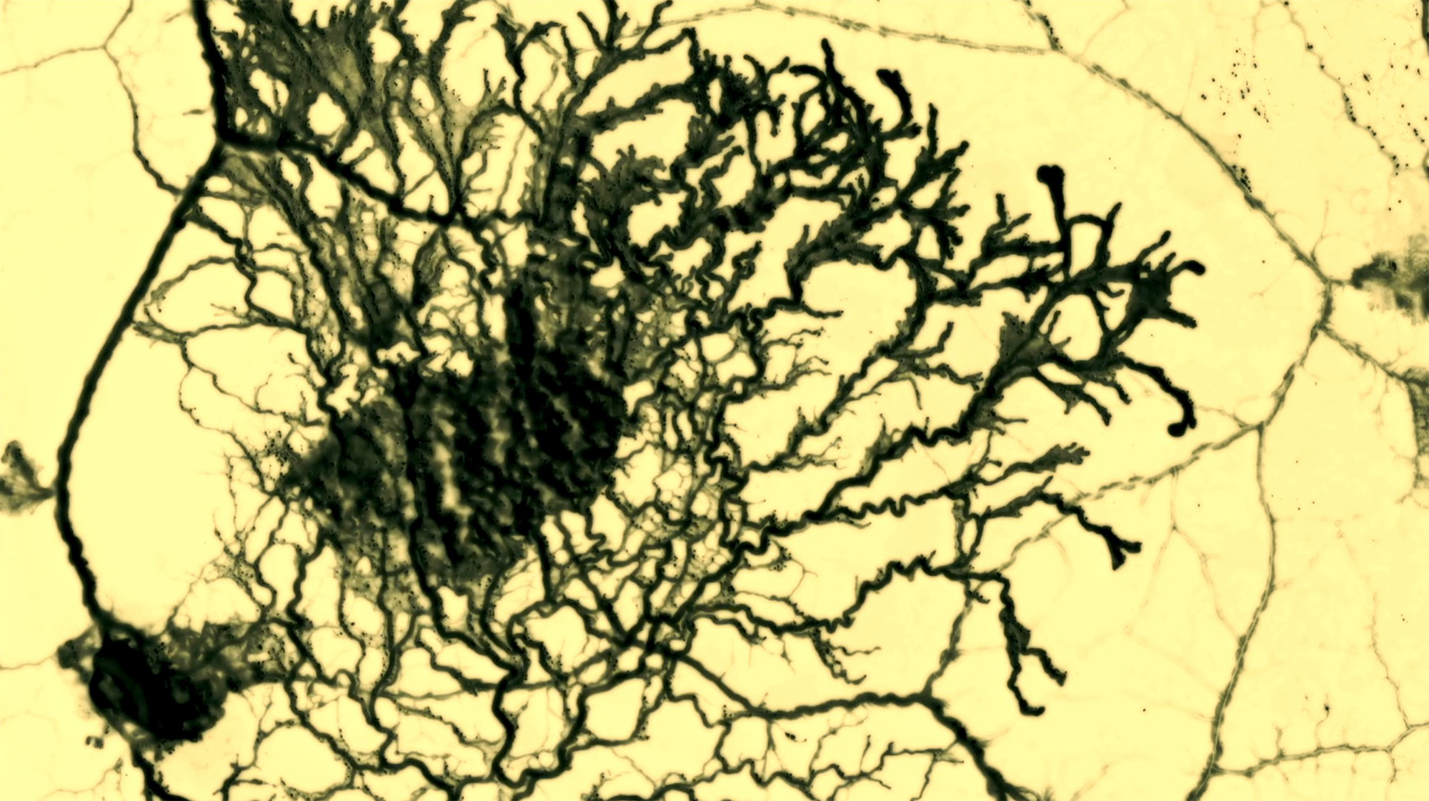 With every movement, the organism develops a network of filaments. The reticular structures, generated by the way the slime searches for nourishment and optimises its paths, constitute the starting material of the work.